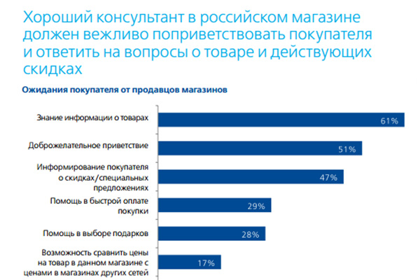 Также исследование показало, чего покупатели в первую очередь ждут от оффлайн-магазинов и магазинов в интернете. От консультантов реальных магазинов покупатели ждут: