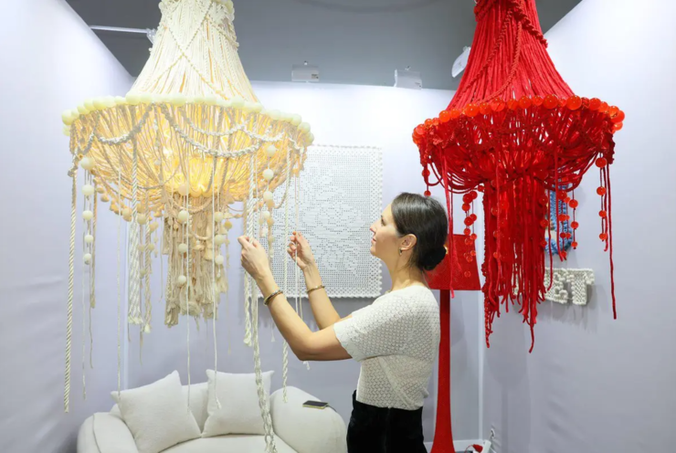 Ирина Гурьянова с брендом Sevirika продемонстрировала изящные плетёные абажуры ручной работы, украшенные бусинами и жемчугом. Эти люстры, некоторые из которых достигают метрового диаметра, создаются около двух месяцев и, как шутит мастерица, могут быть очищены пылесосом.