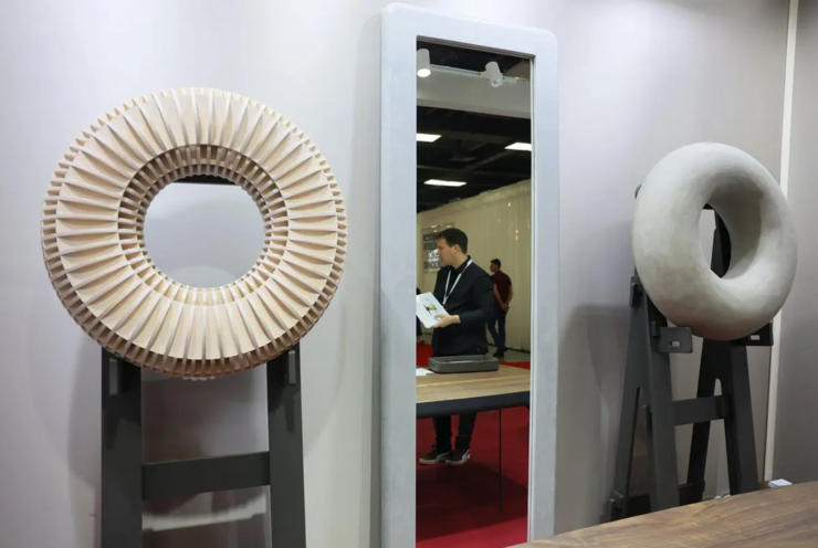 Интерес вызвал и «бетонный бублик» от бренда архитектурной мебели Ply. Этот геометрический тор из фанеры, покрытый микробетоном, демонстрирует универсальность форм: он может служить журнальным столиком под стеклом, пуфиком или даже ножкой для стола, подтверждая тезис о вечности простых и функциональных решений.