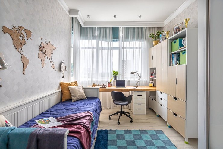Для начала определитесь с тем, где будет стоять мебель — у окна или где-то в углу. Если стол поставят в углу, понадобится дополнительный источник света, обычной лампы будет недостаточно.