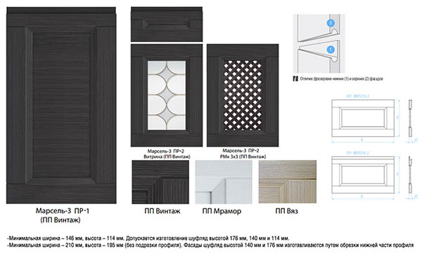 Фасады Марсель-3 ПР-1 и ПР-2 ПП Вяз, ПП Винтаж и ПП Мрамор: