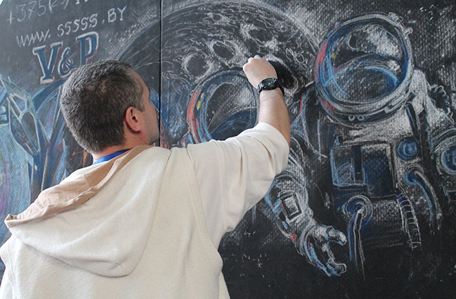 Найти партнеров и клиентов на выставке стараются даже студии дизайна. Художник компании «V and P» рисовал пастелью космические пейзажи на стене, чтобы привлечь внимание гостей.
