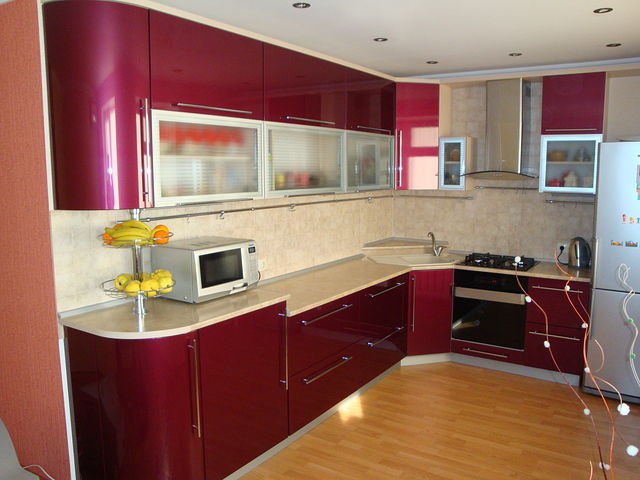 Кухни МДФ из пластика. Также этот вид кухонной мебели называют просто кухнями из пластика. Причиной тому яркие глянцевые фасады из полимера, сразу же приковывающие внимание. И уже забываешь о том, что в основе гарнитура древесные плиты, что внешняя отделка имеет толщину всего несколько миллиметров. Глубина цвета и разнообразие современных кухонь с пластиковыми фасадами просто поражает. А если к ним прибавить стильную фурнитуру, то впору устраивать фотосессии в интерьере. Впрочем, производители не забыли и о функциональности, прочности и легкости в использовании. Купить кухню из МДФ можно без опасений за то, что она через пару лет потеряет свой «товарный» вид, обесцветится или просто потускнеет. Поверхность такой кухни маркая, но и убирать ее легко, при помощи мягких средств на основе мыла.