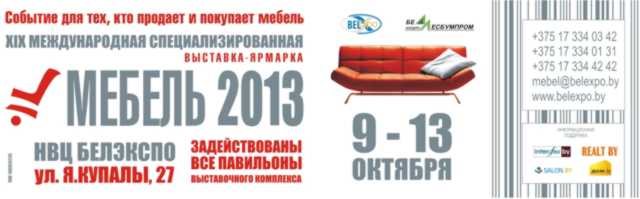 С 9 по 13 октября в Национальном выставочном центре «БелЭкспо» пройдет событие, к которому давно готовятся как потребители, так и мебельщики – 19-я международная специализированная выставка-ярмарка «Мебель-2013».| Место проведения | Национальный выставочный центр «БелЭкспо» (ул. Я. Купалы, 27) |