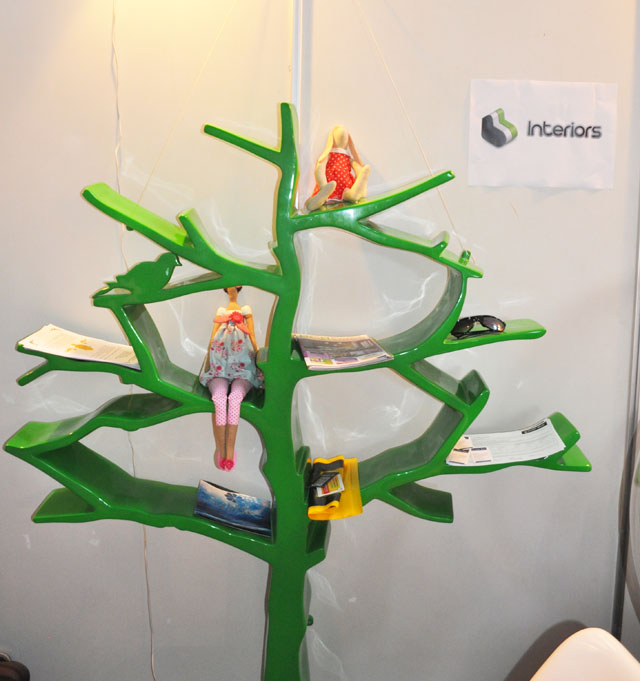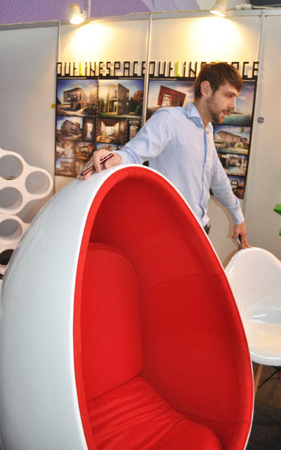 Компания Interiors представляет на выставке дизайнерские предметы мебели. В числе товаров, реализуемых компанией необычные яйцеобразные кресла и полки в форме дерева.