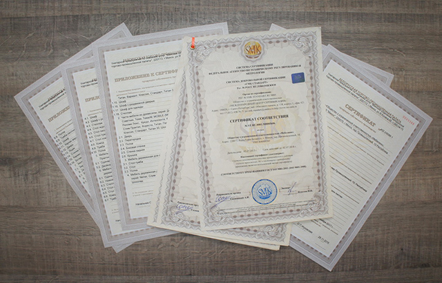 Сертификаты соответствия качества мебели, выданные БТПП и Международным центром сертификации. Мебель соответствует требованиям ГОСТ ISO 9001-2011.