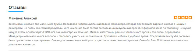 Мы работаем над повышением уровня лояльности наших клиентов. Именно поэтому у нас работает третий уровень системы контроля качества. По итогам продаж каждого месяца анализируется удовлетворенность клиентов. Делаем это самым простым способом – с помощью телефонного звонка и личного общения с клиентом. Мы уточняем у клиента все нюансы: все ли ему понравилось в нашей мебели, есть ли какие-то замечания. Все стремятся к тому, чтобы наши покупатели были максимально удовлетворены работой компании и советовали нашу мебель своим друзьям и знакомым.