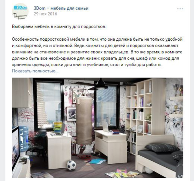Уже почти год компания ведет свою страницу в социальных сетях: ВКонтакте, Фейсбуке, Одноклассниках, есть группа в Инстаграмм. Оттуда также приходят клиенты, иногда человеку проще задать вопрос в группу и там получить ответ по стоимости, наличию, цветам и характеристикам мебели. В группах мы размещаем публикации о том, кто правильно выбрать мебель для дома, новинки своей продукции, информацию об акциях, скидках и распродажах, а также различный развлекательный контент на семейную тему.