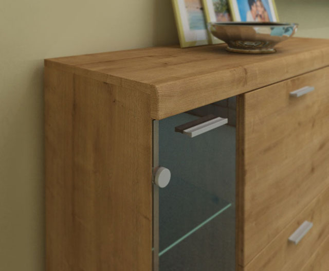 Элементы из МДФ сверху и снизу с верхней и нижней крышкой комода «Деметра» создают плавную линию и перетекают один в другой.