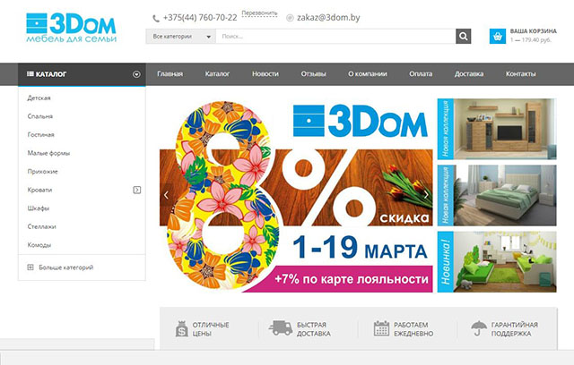 Также у нас есть свой сайт 3dom.by, который является интернет-магазином, и часть клиентов делает заказ через него. Чаще всего это люди, которые уже делали у нас заказ, знают качество нашей мебели и уверены в нем.