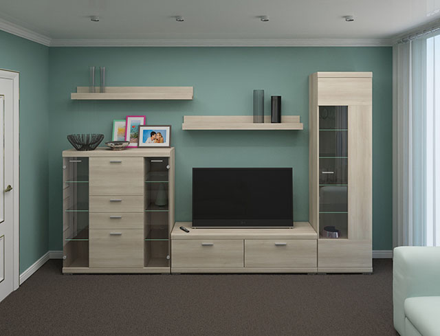 Стоимость комплекта, состоящего из шкафа-витрины, тумбы под ТВ, комода и полки, — 963,60 руб.