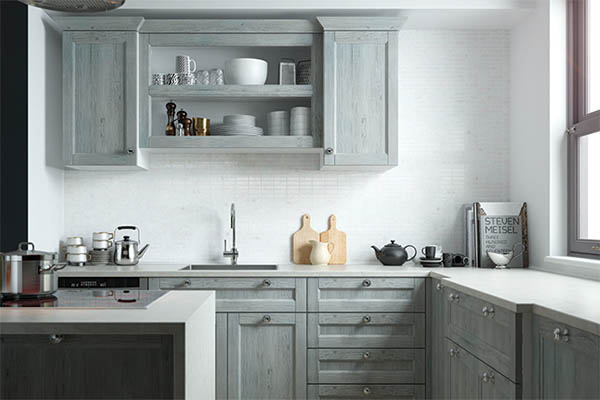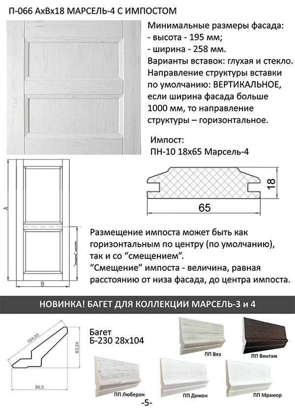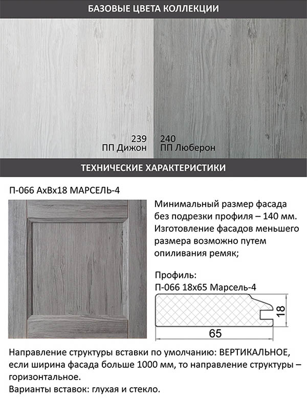 Новые фасады выполнены в стиле прованс в двух басовых цветах: ПП Дижон и ПП Люберон. Минимальный размер фасада — 140 мм, для варианта с импостом — 258х196 мм (ШхВ). Цвета новых багетов: ПП Винтаж, ПП Вяз, ПП Дижон, ПП Люберон и ПП Мрамор.