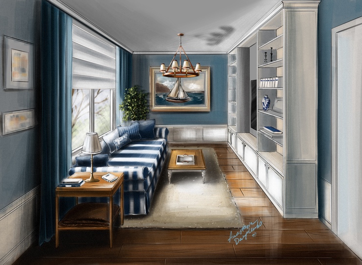 Постепенно я увлеклась рисованием интерьеров. Сначала создавала эскизы для себя, потом начала работать на заказ. В этих проектах воплотилось всё, что мне близко: пространство, свет, текстуры, ощущение уюта. Так эскизы стали делом, которое действительно меня вдохновляет.