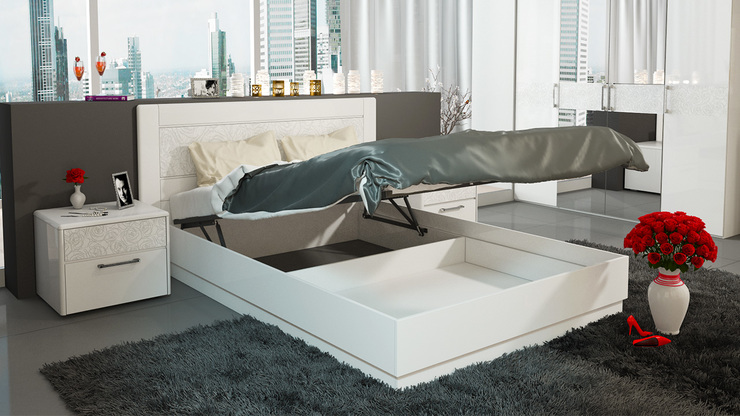 Подъемный механизм для кровати позволяет легко поднимать основание конструкции и получать беспрепятственные доступ к содержимому ящиков. Данная система делает проще и удобнее использование внутреннего пространства кровати для хранения различных вещей.