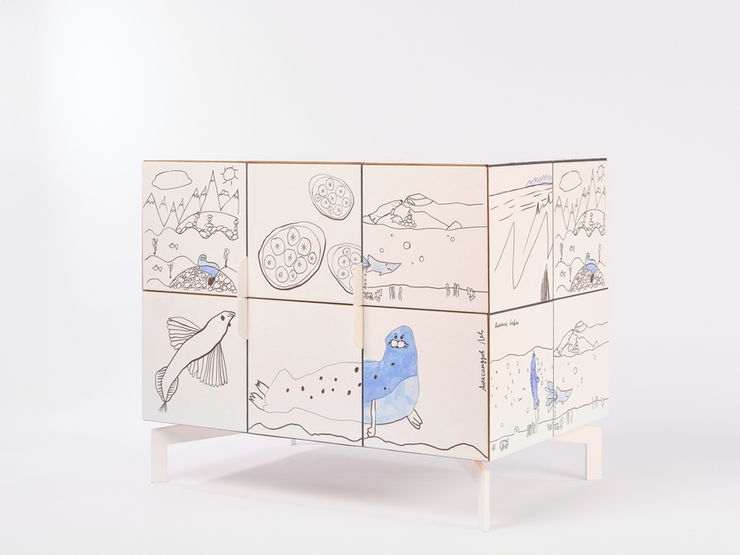 Рисунки, созданные юными художниками, затем переносятся на плитку. Она служит материалом для отделки корпусной мебели. В коллекцию также входит кровать, настоящие ложе, и текстильные объекты.