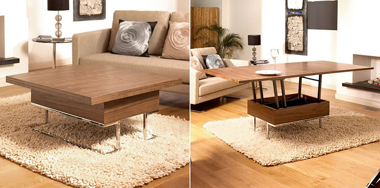 Самый современный тип столов-трансформеров, механизм которого позволяет изменять как размеры столешницы, так и высоту стола за счет пружинного или пневматического подъемника. Несомненный плюс этого стола в том, что когда его собрать, получается компактный журнальный столик, который занимает минимум места. А при раскладывании его площадь может увеличиться более чем в четыре раза.