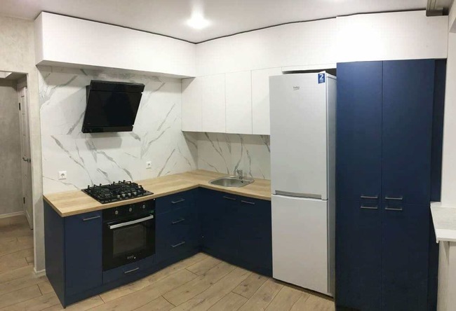 • Все модули стандартные, поэтому не нужен профессиональный дизайн-проект, как если бы вы решили сделать кухню на заказ. Каждый модуль обычно имеет два-три варианта, например, шкафы могут быть двух- или трехстворчатыми, а также разных размеров.