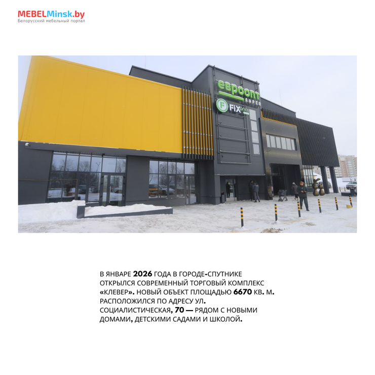 Одним из первых событий года стало открытие в январе 2026 года современного торгового комплекса «Клевер» в городе-спутнике Смолевичи. Объект площадью 6670 кв. м. расположен по адресу ул. Социалистическая, 70, удобно интегрируясь в активно развивающийся жилой район, рядом с новыми домами, детскими садами и школой. Комплекс призван стать новой точкой притяжения для жителей региона.