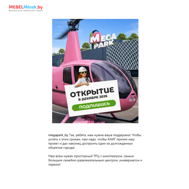 К концу года, в декабре 2026-го, планируется открытие многофункционального ТРЦ Mega Park в Каменной Горке. Проект обещает стать центром притяжения для всей семьи благодаря наличию кинотеатра, крупнейшего семейно-развлекательного центра, универмага и парковой зоны. Точные сроки открытия зависят от времени утверждения проекта Комитетом архитектуры и градостроительства Мингорисполкома, отмечают застройщики в официальных соцсетях.