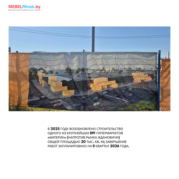 Второе полугодие 2026 года обещает пополнение в сегменте товаров для дома и ремонта. В 2025 году было возобновлено строительство одного из крупнейших DIY-гипермаркетов «Материк» общей площадью 20 тыс. кв. м, расположенного напротив рынка Ждановичи. Завершение работ и открытие объекта запланировано на второй квартал 2026 года.