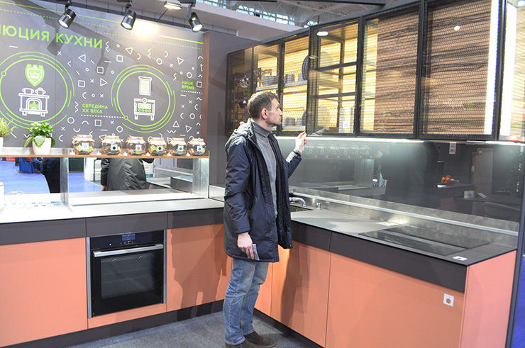 В своем выступлении Наталья рассказала, как на примере представленной на экспозиции стильной кухни от «МебельХолл», которая на минуточку стоит примерно 12,5 тыс долларов, рассказала, какие материалы сегодня в тренде.