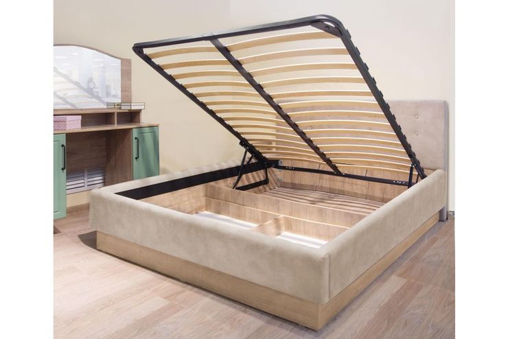 Функциональная модель — все пространство под спальным местом используется для хранения постельного белья и других вещей. Благодаря большим размерам отсека, есть возможность хранить в нем крупногабаритные вещи. Пользоваться подъемным механизмом достаточно просто, так как он оснащен гидравлическим амортизатором.