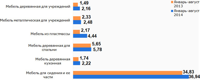 Экспорт некоторых видов мебели из Беларуси в январе-августе, $ млн (по данным Белстата)