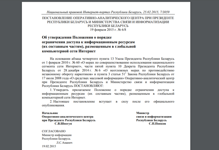 В 2015 году ОАЦ при Президенте РБ и Министерство связи и информатизации опубликовали постановление «Об утверждении Положения о порядке ограничения доступа к информационным ресурсам (их составным частям), размещенным в глобальной компьютерной сети Интернет».