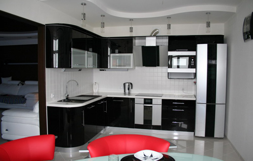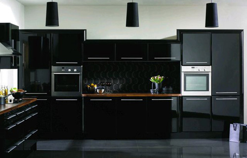 Черный цвет широко используется в стиле хай-тек, поскольку он отлично сочетается с металлическими и стеклянными принадлежностями. Он привносит в обстановку сдержанность и строгость, на такой кухне будет психологически комфортно решать семейные вопросы. Чтобы черный цвет не действовал угнетающе, необходимо его обязательное разбавление светлыми тонами, например, белым.