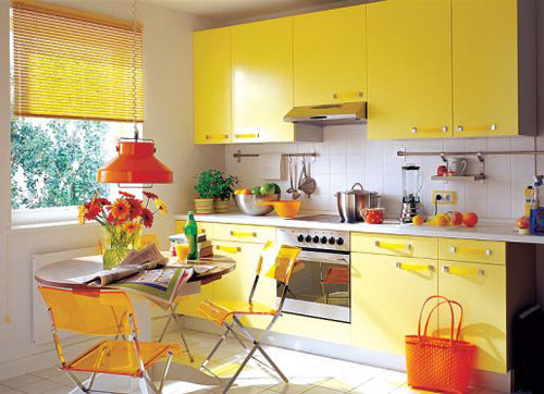 Желтый цвет кухни воплощает собой радостную атмосферу. Желтые стены делают теплее холодные тона в интерьере. Как и в случае с красным исполнением кухни, не стоит склоняться к ярким оттенкам, так как со временем они начнут выглядеть угнетающе. Желтый цвет идеально гармонирует с серебристым металликом, голубым и белым цветом. Не стоит использовать пастельные оттенки желтого в слабо освещенных помещениях, поскольку они будут смотреться уныло и блекло.