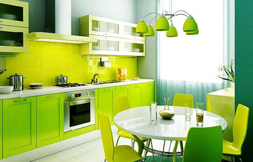 Не менее жизнерадостно смотрится зеленая кухня. Зеленый цвет навевает спокойствие и беззаботность, благотворно влияет на пищеварительный процесс. Такой вариант отлично подойдет для ярких экспрессивных личностей.