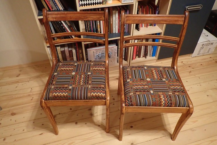 Два стула купили мои родители, когда мы въехали в новую квартиру, – это был 1987 год. Они очень крепкие, сделаны из минимума частей, поэтому за столько лет не развалились, хотя, конечно, в детстве мы с братом на них постоянно раскачивались. Мама несколько раз их перетягивала и подкрашивала и покрывала лаком. Когда мы с женой въехали в свою собственную квартиру, я забрал эти стулья себе. Мы сами их перетянули гобеленовой тканью, купленной в ГУМе, проложили новый поролон, а под поролон я засунул записочку с «посланием потомкам».
