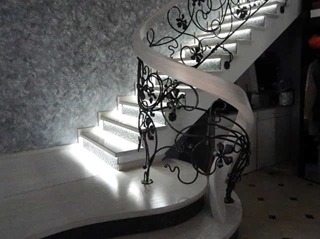 Затем мы отправляемся в сборочный цех. В производственном помещении тепло и сухо. Здесь хранится весь материал. Мастер работает над лестничными перилами. Полоска за полоской изделие выклеивается и формируется, ему придается нужная форма. На наших глазах кусок древесины превращается в деталь для изящной лестницы.