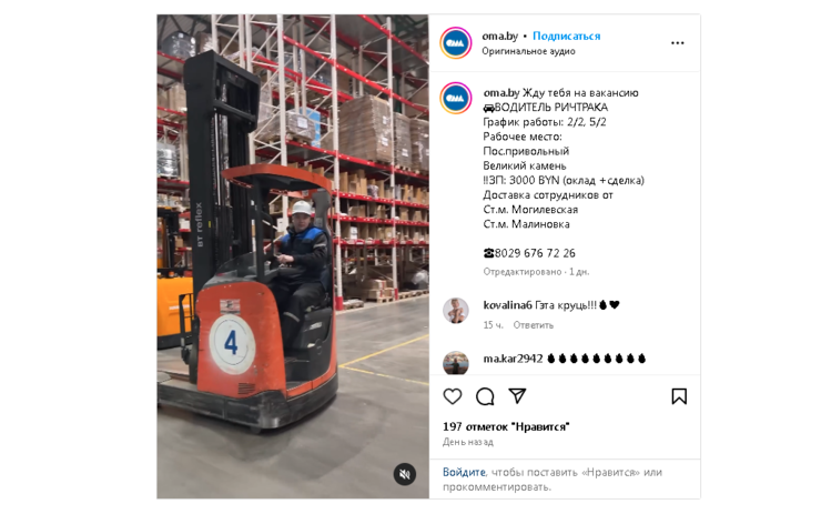 В Instagram-аккаунте сети строительных материалов ОМА появилось объявление о вакансии – требуется водитель погрузчика (ричтрак).
