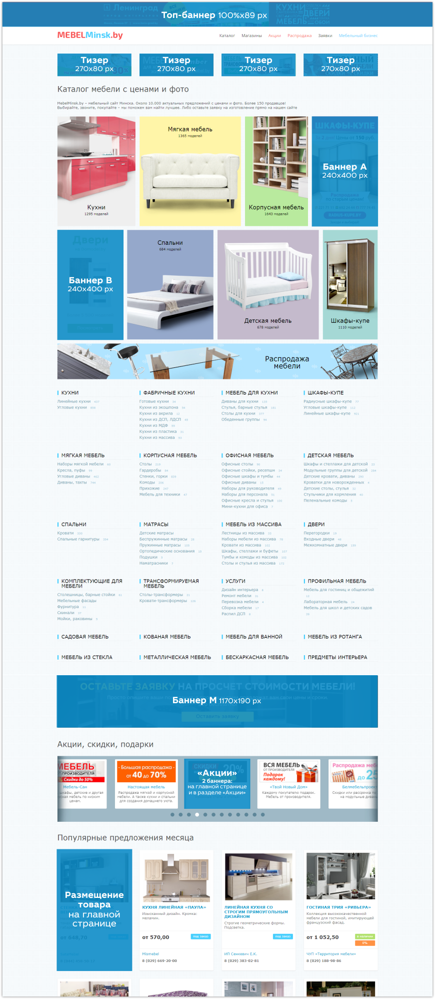 Все перечисленные баннеры активны (пользователь по щелчку переходит на указанный сайт, либо на страницу mebelminsk.by), могут быть в форматах GIF, JPEG, PNG, объем файла не более 50kb. Не принимаются моргающие или монотонно изменяющиеся баннеры, которые своим присутствием на страницах сайта могут раздражать посетителей.